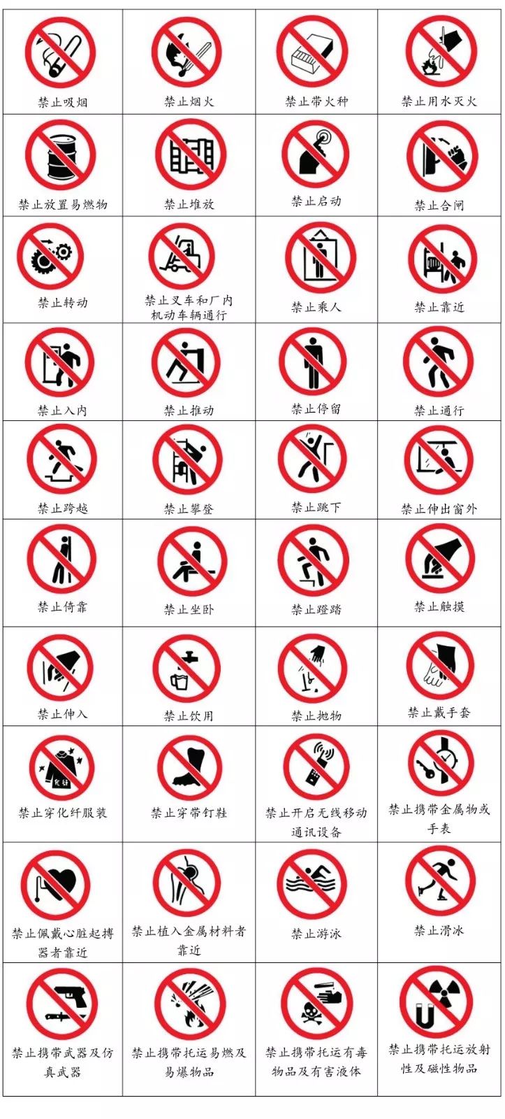《图形符号安全色和安全标志 第5部分:安全标志使用原则与要求》, 将于2020年10月1日起正式实施。 禁止标志是禁止人们不安全行为的图形标志。禁止标志的几何图形是带斜杠的圆环,其中圆环与斜杠相连,用红色;图形符号用黑色,背景用白色。 警告标志是提醒人们对周围环境引起注意,以避免可能发生危险的图形标志。警告标志的几何图形是黑色的正三角形、黑色符号和黄色背景。 指令标志是强制人们必须做出某种动作或采用防范措施的图形标志。指令标志的几何图形是圆形,蓝色背景,白色图形符号。 提示标志是向人们提供某种信息(如标明安全设施或场所等)的图形标志。提示标志的几何图形是方形,绿色背景,白色图形符号及文字。 安全标志应设置在与安全有关的明显地方,并保证人们有足够的时间注意其所表示的内容。 设立于某一特定位置的安全标志应被牢固地安装,保证其自身不会产生危险,所有的标志均应具有坚实的结构。 当安全标志被置于墙壁或其它现存的结构上时,背景色应与标志上的主色形成对比色。 对于那些所显示的信息已经无用的安全标志,应立即由设置处卸下。 为了有效地发挥标志的作用,应对其定期检查,定期清洗,发现有变形,损坏,变色,图形符号脱落,亮度老化的情况,应及时更换。