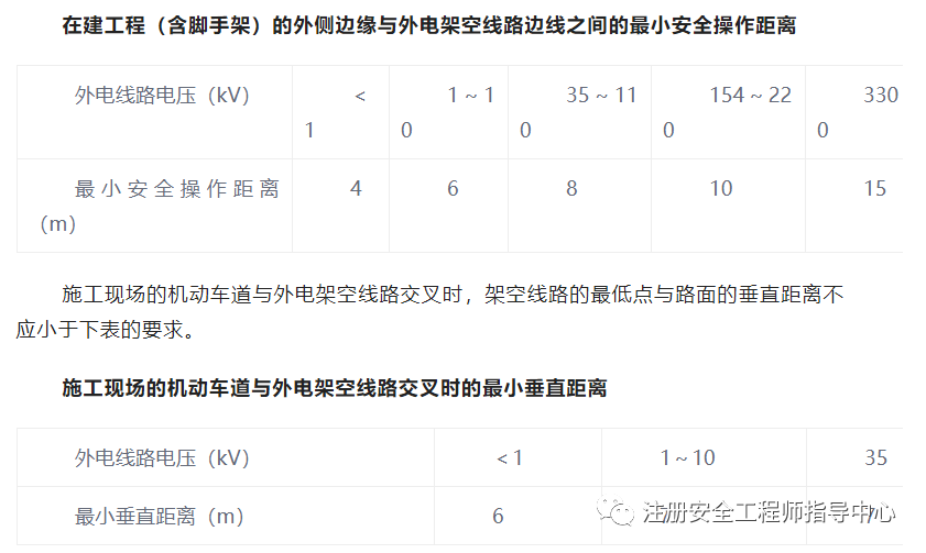 在建工程(含脚手架)的外侧边缘与外电架空线路的边线之间应保持安全操作距离。最小安全操作距离应不小于下表的要求。