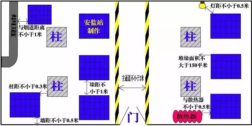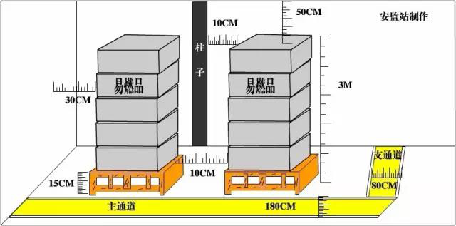 (GB17914-2013)6.2:堆垛间距:主通道大于或等于180cm,支通道大于或等于80cm,墙距大于或等于30cm,柱距大于或等于10cm,垛距大于或等于10cm,顶大于或等于50cm。