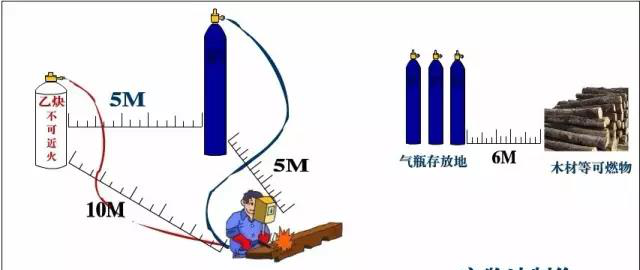 (GB9448-1999)10.5.4:气瓶必须距离实际焊接或切割作业点足够远(一般为5 m 以上),以免接触火花、热渣或火焰,否则必须提供耐火屏障;