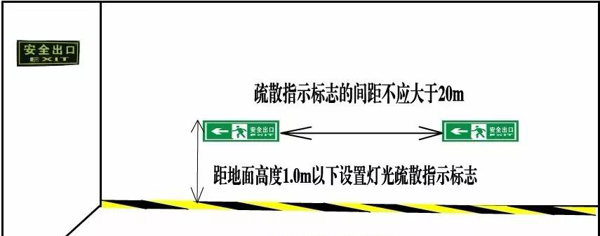 (GA654-2006)8.3.4.1:应在疏散走道转弯和交叉部位两侧的墙面、柱面距地面高度1.0m以下设置灯光疏散指示标志;确有困难时,可设置在疏散走道上方2.2m~3.0m处;疏散指示标志的间距不应大于20m。