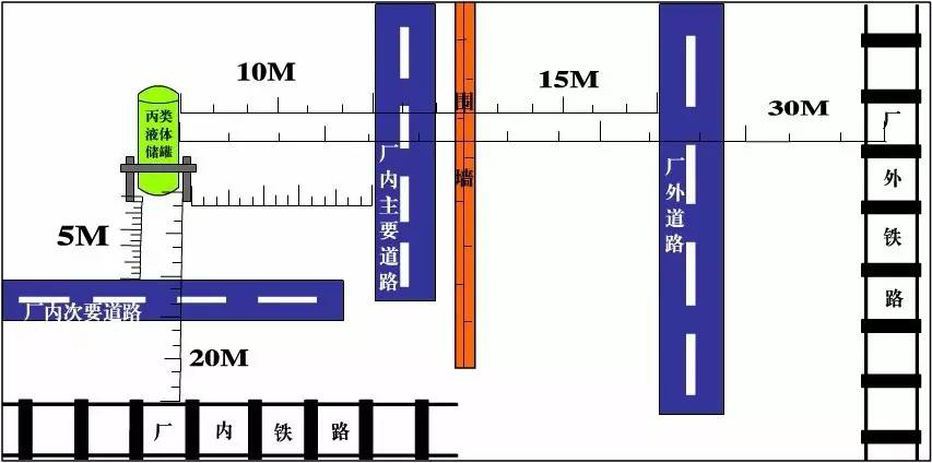 (GB50016-2014)4.2.9:丙类液体储罐与厂外铁路中心线、厂内铁路中心线、厂外道路路边、厂内主要道路路边和厂内次要道路路边的防火间距不应小于30、20、15、10和5m。