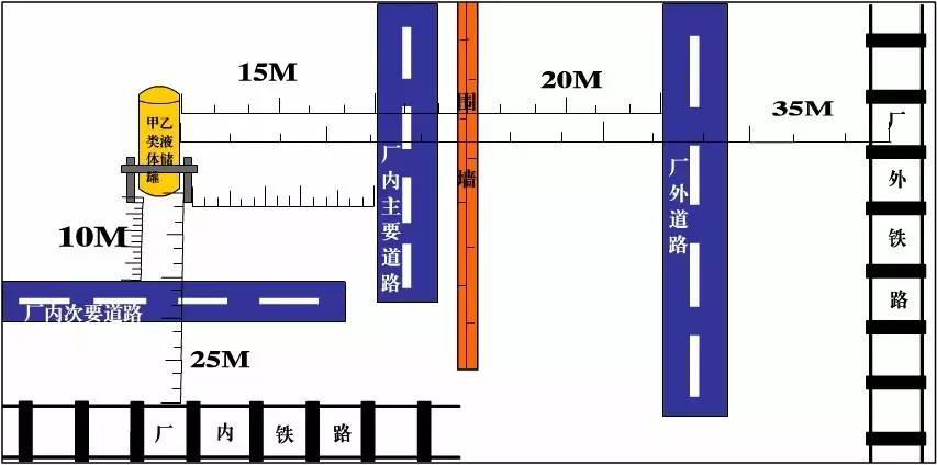 (GB50016-2014)4.2.9:甲、乙类液体储罐与厂外铁路中心线、厂内铁路中心线、厂外道路路边、厂内主要道路路边和厂内次要道路路边的防火间距不应小于35、25、20、15和10m。