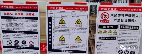 牌——警示牌。污水池入口处、楼梯处各设置三块尺寸统一的警示牌(告知牌、警示栏、操作规程);污水池栏杆处每个方向至少设置一块警示牌。