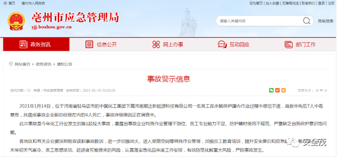 官方通报:2021年1月14日,位于河南省驻马店市的中国化工集团下属河南顺达新能源科技有限公司一名员工在水解保护罐内作业过程中感觉不适,施救中先后7人中毒窒息,共造成事故企业副总经理在内的4人死亡,事故详细原因正在调查中。此次事故是今年化工行业发生的第1起较大事故,暴露出事故企业特殊作业管理不到位、员工专业能力不足、防护器材使用不规范、严重缺乏自我保护意识等问题。