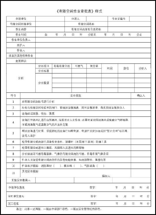 表——作业审批表。作业前填写审批表并确认,无误后方可作业。