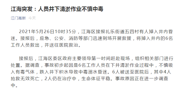 接报后,江海区委区政府主要领导第一时间赶赴现场,组织相关部门进行处置。据调查,事故初步起因是6名工作人员在下井清淤作业过程中,不慎吸入有毒气体,跌入井下积水导致中毒溺水昏迷。6人被送至医院后,其中4人抢救无效死亡,2人仍在治疗中,生命体征平稳。事故原因正在进一步调查中。