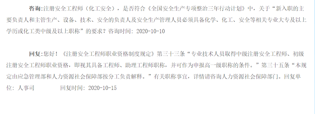3、注册安全工程师(化工安全)是否符合“具备化学、化工、安全等相关专业大专及以上学历或化工类中级及以上职称”的要求?