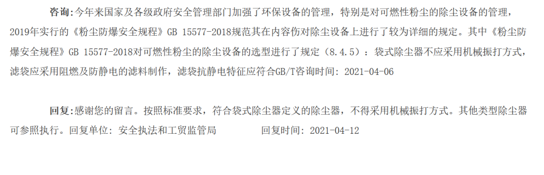 1、可燃性粉尘除尘设备是否禁止使用机械振打方式除尘设备