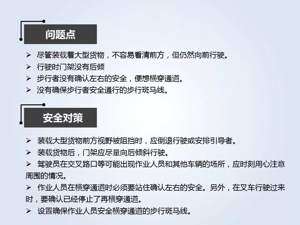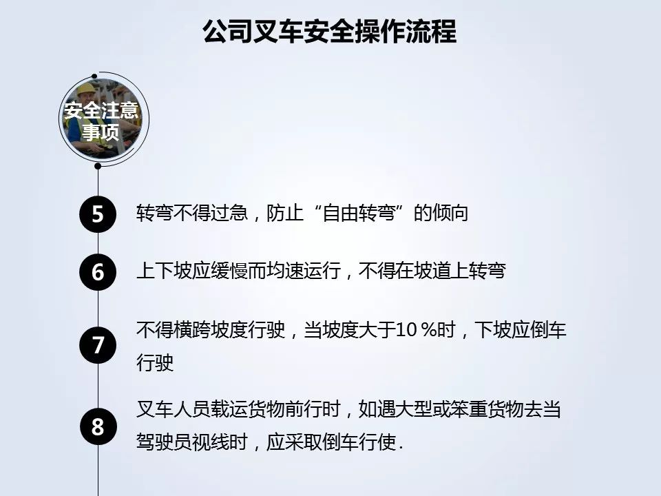 作业前检查灯光、倒车警报装置是否齐全有效; 叉车作业范围1.5米内不得有人靠近(企业要求) 叉车倒车时,驾驶员须先查明周围情况,确认安全后,方可倒车; 在厂房、仓库、窄路等处倒车时,应有人站在驾驶员的侧后方指挥。 驾驶叉车应系好安全带; 不得随意改装叉车,叉车不得用于抬升作业; 叉车所有部位禁止站人、搭乘其他人员; 不得超载,载物行驶时,货叉不准升得太高,以免影响叉车的稳定性。 驾驶叉车应系好安全带; 叉车转弯时,如附近有行人或车辆,应先发出行驶信号; 禁止高速急转弯,高速急转弯会导致车辆失去横向稳定而倾翻。 叉车禁止超载,载物高度不得遮挡驾驶员视线; 特殊情况物品影响前行视线时,需倒车行驶,倒车时要低速行驶。 叉车所有部位禁止站人、搭乘其他人员; 叉车禁止超载,行驶过程中双叉或运送的物件离地高度不得大于0.5米。