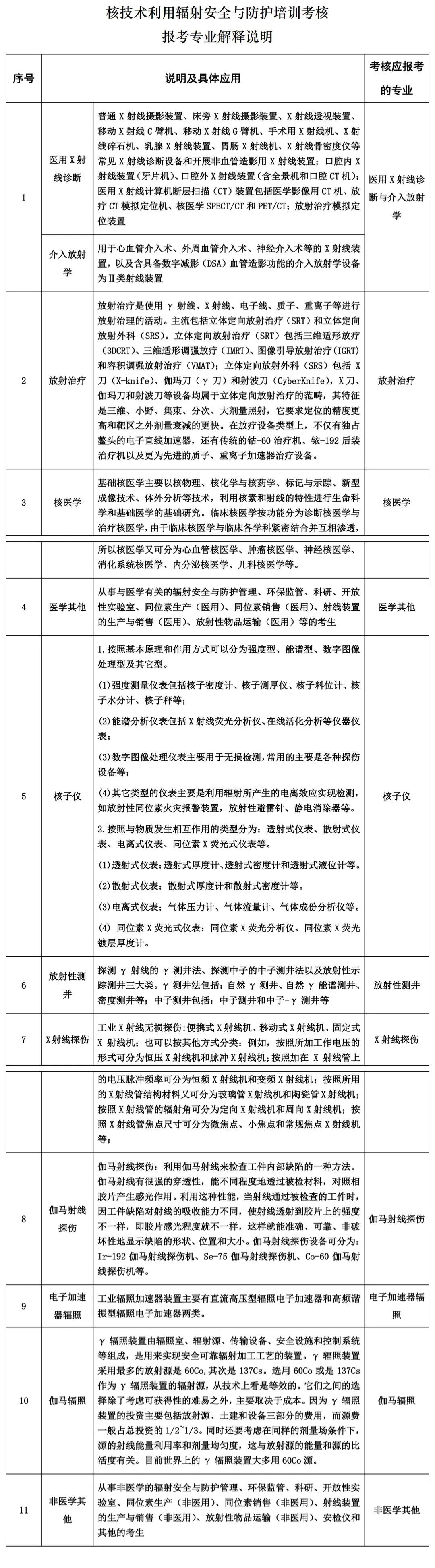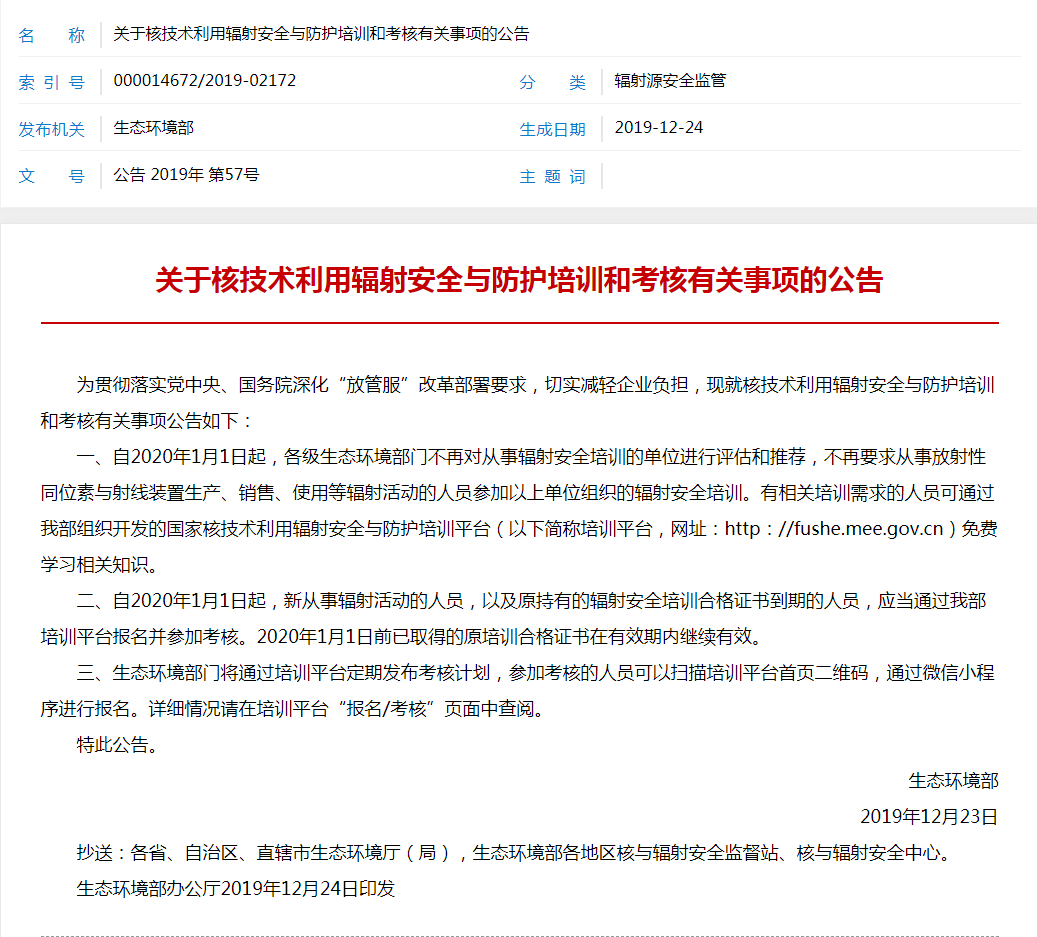 目前应如何培训和考核? 接生态环境部通知,自2020年1月1日起,各级生态环境部门不再对从事辐射安全培训的单位进行评估和推荐,不再要求从事放射性同位素与射线装置生产、销售、使用等辐射活动的人员参加原推荐单位组织的辐射安全培训。有相关培训需求的人员可通过生态环境部组织开发的国家核技术利用辐射安全与防护培训平台(以下简称培训平台,网址:http://fushe.mee.gov.cn)免费学习相关知识。公告原文如下: 现在考生需自行在培训平台学习,通过微信小程序报名成功后(唯一的报名渠道)取得准考证,进行线下集中考核。网上学习和考核不收取费用。 哪些人需要参加考核? 报名条件:一、年满16周岁,具备完全民事行为能力;二、从事或准备从事核技术利用辐射相关工作。 同时满足以上两个条件的人员就必须参加考核,成绩合格才能从事核技术利用辐射相关工作。 考核报名有哪些注意事项? (1)核技术利用辐射安全与防护考核采用指定微信小程序报名(微信小程序搜索HJSLY或扫描上文二维码),每位考生一年最多可获得三次考核机会。允许通过微信小程序为他人报名。报名请提前准备好免冠证件照(电子版),认真填写报名相关信息。 【特别提醒:每位考生一年最多可获得三次考核机会,并非每个科次有三次的考核机会,报名且显示审核通过却不来参加考试也算作一次,如果三次考试都不合格就等下一年再报考。请考生珍惜考核机会,不要连续报考。】 (2)核技术利用辐射安全与防护考核为闭卷考核,考核时长为60分钟。考核科目分为医学(医用X射线诊断与介入放射学、放射治疗、核医学,并设医学其他)和非医学(X射线探伤、伽马射线探伤、电子加速器辐照、伽马射线辐照、核子仪、放射性测井,并设非医学其他),合计十一类。 (3)请考生根据个人辐射工作类别选择对应的考核科目进行报名。从事辐射安全与防护管理、环保监管、科研、开放性实验室、同位素生产、同位素销售、射线装置的生产与销售、放射性物品运输、安检仪和其他辐射工作类别的考生可根据行业相关性选择医学其他或非医学其他。 (4)考生报名后需经考核机构审核,审核通过即报考成功,请于开考前下载并打印准考证,认真核对报名信息,获知具体的考核地点。 如何选择报考专业? 改革后,考核科目不再是医学和工业两大类,而是分为医学(医用X射线诊断与介入放射学、放射治疗、核医学,并设医学其他)和非医学(X射线探伤、伽马射线探伤、电子加速器辐照、伽马射线辐照、核子仪、放射性测井,并设非医学其他),合计十一类。请考生根据个人辐射工作类别选择对应的考核科目进行报名。若无对应专业,则报考“医学其他”或“非医学其他”,该类学员选择相对接近的专业实务类视频进行学习。 试卷结构如下: 电离辐射安全与防护考核题型为客观题,分为单项选择和多项选择题。单项选择题要求从备选项中选择一个最符合题意的选项。多项选择题要求从备选项中选择两个或两个以上符合题意的选项,错选不得分;漏选,则所选的每个选项得1分。试卷总分120分,含40道单项选择题(每题2分)和10道多项选择题(每题4分),考核时长为一小时,72分及格。 如何学习? 通过注册登录国家核技术利用辐射安全与防护培训平台(以下简称培训平台,网址:http://fushe.mee.gov.cn)进行自学,请各位考生多去熟悉平台各个模块,学习资料在“课程中心”和“资源中心”获取,报名及考核的相关信息看“报名/考核”。 国家核技术利用辐射安全与防护培训平台(以下简称“培训平台”)是生态环境部开展“互联网+培训”的重要实践,以保障环境、公众的辐射安全和辐射从业人员的职业健康为目的,鼓励核技术利用辐射从业人员开展自我培训。 为推动线上培训与学员自主学习,培训平台提供视频类和文档类培训资源如下: (1)视频培训资源 培训平台提供2门公共科目(基础和法律)和9门专业科目共计23个小时的视频培训内容。辐射从业人员可根据自身工作需要选择对应的科目进行学习,报考医学其他和非医学其他专业的学员可根据自身需要从9门专业科目中选择自身相关的专业科目进行学习。 资源入口:课程中心 http://fushe.mee.gov.cn/index.php?a=course&m=Index (2)文档类培训资源 培训平台提供11个科目的应知应会文档资源,供学员在线学习与下载。 资源入口:资源中心/常见下载/培训资料 http://fushe.mee.gov.cn/index.php?a=resource&m=Index (3)拓展类学习资源 培训平台还提供专业实操、辐射科普、经典案例等拓展类学习资源,并将在常见下载中增加核技术利用法律法规和标准类学习资源。 报名难怎么办? 照片不合格怎么办? 请考生严格按照报名照片尺寸与质量要求上传照片: 报名照片必须是正规的电子证件照,应为个人近期免冠(不戴帽子)白底、蓝底或红底标准两寸电子证件照。不得随意拍照上传。不得使用翻拍的证件照或其他生活照、艺术照。照片需要包含整个面部、耳朵、颈部和肩膀,不闭眼,直视镜头。两寸证件照尺寸为3.5*5.3cm,分辨率最低300dpi,对应的像素为413*626像素,照片存储大小不超过200KB。考核系统支持常见的JPG、BMP、PNG、JIF照片格式,并支持对已有照片进行裁剪。请考生认真按照要求参照下图示例上传照片,避免报名审核不通过。 特别提醒:请所有考生报名时务必填完整、准确填写报名信息,包括工作单位、单位所在城市、从事